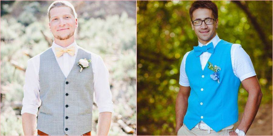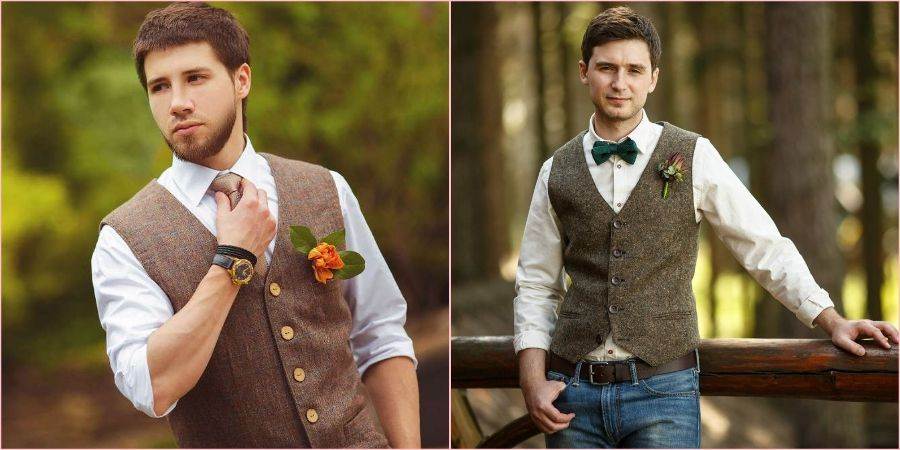 Добавление жилета к костюму может сыграть ту же роль, что и двубортный костюм, но жилет всегда можно снять, и вернуться к обычному однобортному костюму из двух частей. Свадебные фотографы любят делать расслабленные фото с женихом только в жилете и брюках, с пиджаком, перекинутым через плечо, поэтому готовьтесь снимать и надевать одежду, если выбрали костюм с жилетом.