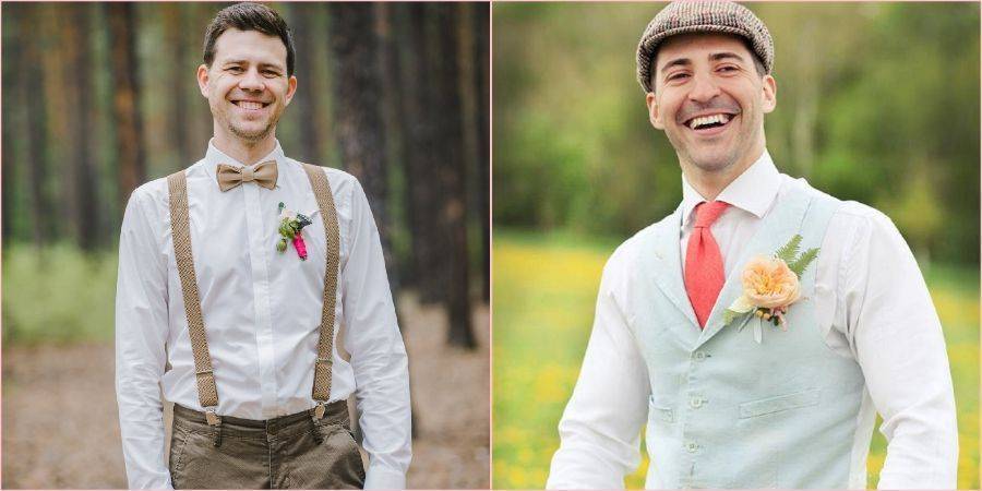 Отлично будет смотреться жених в рубашке с коротким либо подвернутым рукавом, брюках с подтяжками и жилетке. Если хочется дополнить образ пиджаком, то уместно выбрать его в клетку. В качестве аксессуаров используйте шляпу или фуражку, бабочку, интересную бутоньерку, например, из колосков пшеницы.