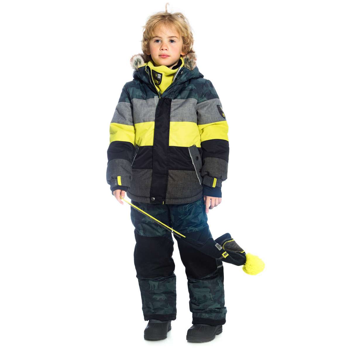 Стильный костюм для мальчика. На куртке два прорезных кармана, а также на левом рукаве кармашек для мелочей. На манжетах имеются липучки – утяжки. Также у куртки есть внутренняя защита от продувания. Мех на капюшоне можно отстегнуть. Полукомбинезон имеет усиление на коленях и ягодицах. Пояс можно регулировать по ширине, лямки можно отстегнуть.