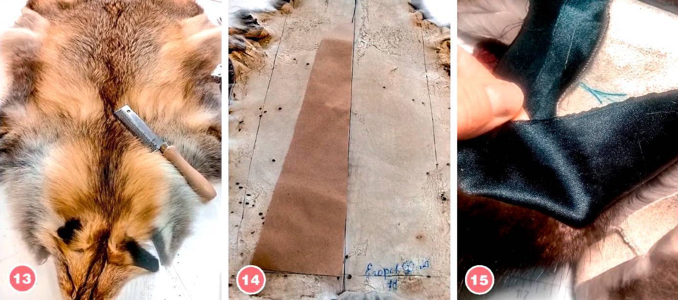 7. Откорректировать линию хребта шкурки, начертив ее прямой линией. Наложить лекало детали одной части опуши на шкурку (к хребтовой линии) таким образом, чтобы направление роста волос было снизу вверх (14). В таком случае мех выглядит пышнее, а цвет глубже. Зеркально расположить лекало второй части опуши.