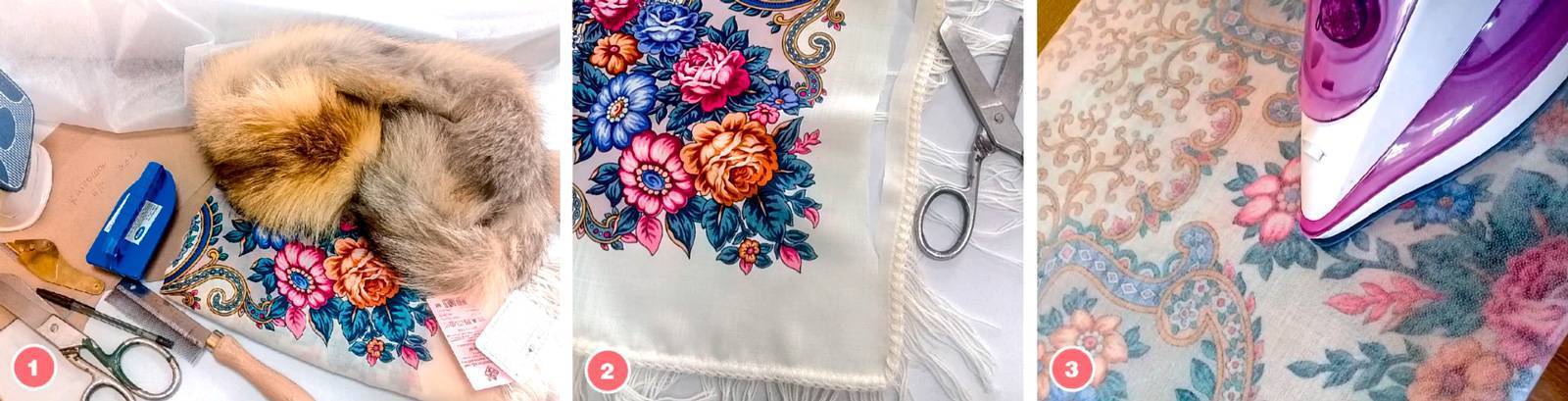 Далее, надо решить какая часть ткани будет обшита дорогим аксессуаром. Если изделие обшить полностью по всему периметру, то такую вещь, будет крайне сложно завязать на голове. Богатый мех утяжелит ткань и сделает ее объемной, в таком виде она больше подойдет для ношения ее на плечах.