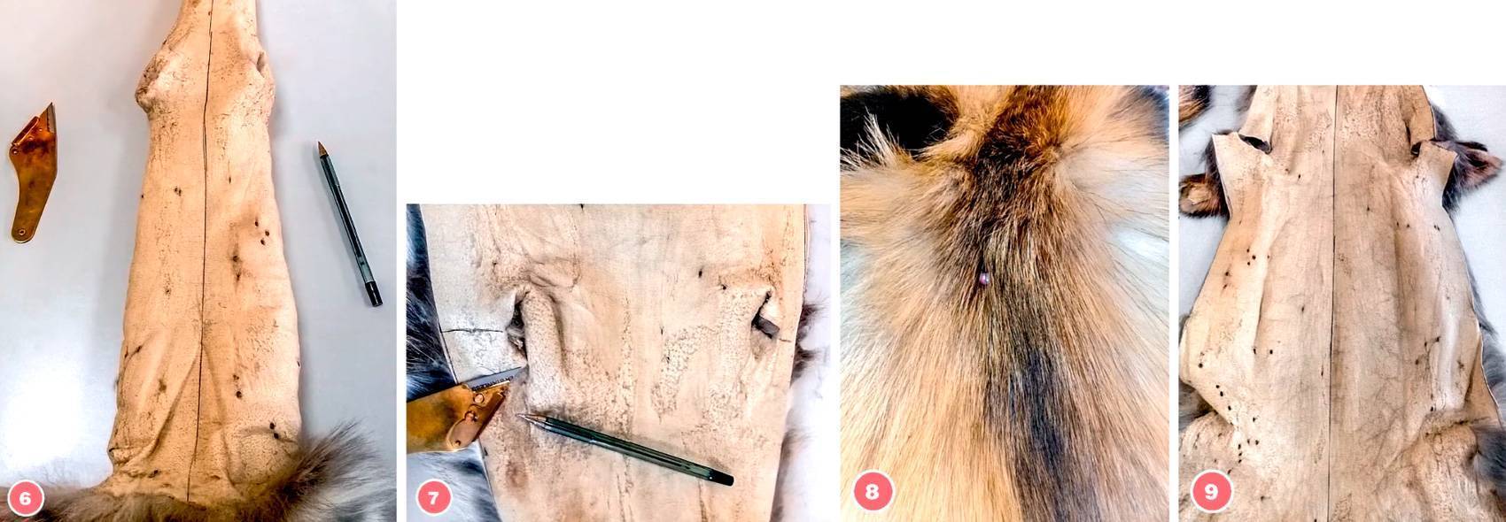 1. Разрезать шкурку лисицы по череву от огузка к головке. Обрезать передние лапы и хвост (6, 7).