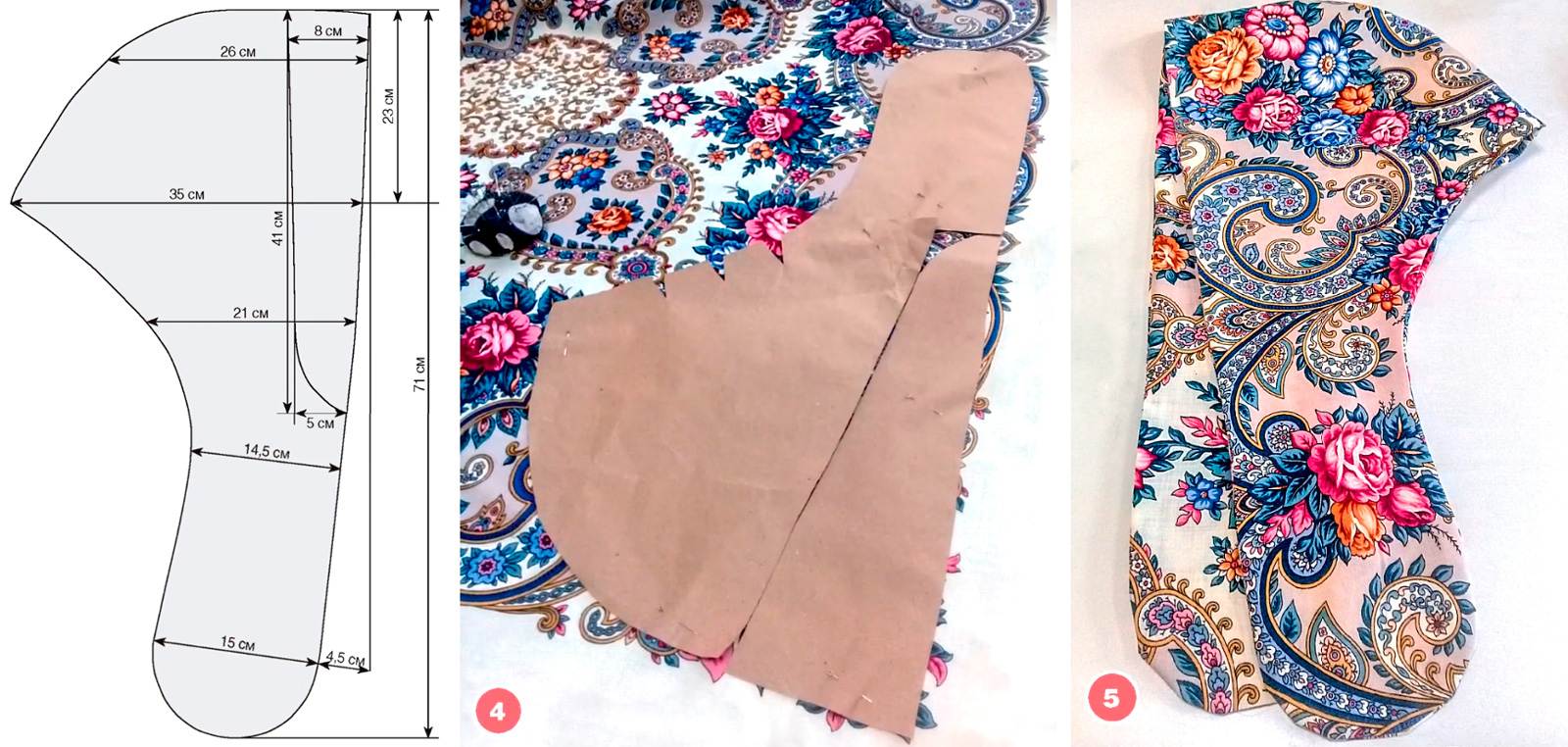 Подогнуть припуски по краям отверстия на изнаночную сторону и подшить сгибы вручную. Приутюжить (5).