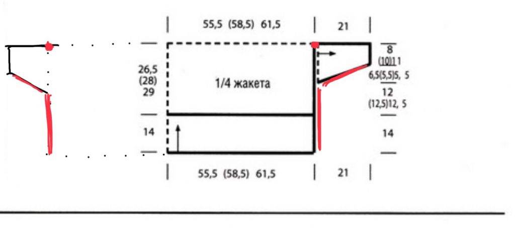 Затем складываем работу изнанкой внутрь, совмещая 2 красные точки на схеме. Берём иглу, сшиваем рукава и боковые части (на схеме красные линии). Выворачиваем налицо. Складываем точно так, как в предыдущей работе.