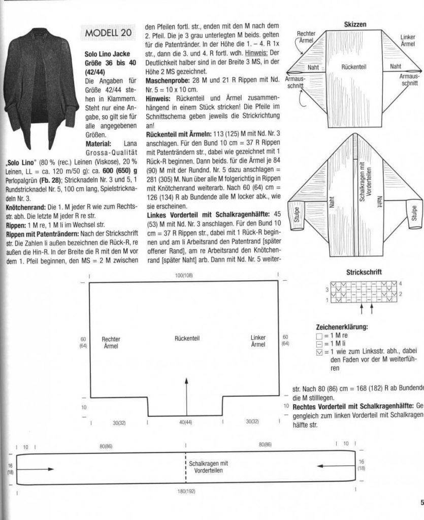 Очень модная сейчас модель кардигана – вариант с рукавами. Планка выполняется любой нужной вам ширины и подворачивается на любую ширину по горловине. Кардиган выполнен без плечевых швов одним полотном. Для рукавов поднимать петли по краям полотна и вязать резинку вдоль или поперёк. Размеры: 38/40; 42/44; 46/48. Работа состоит из двух планок (в начале и в конце) и полотна с жемчужным узором между ними. Стрелки на схеме показывают направление вязания.