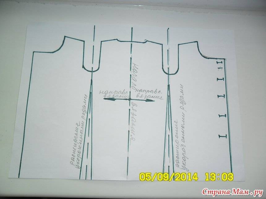 Затем сантиметром вымеряем на кардигане размер проймы, сравниваем с линией оката на рукаве, коррректируем в случае необходимости линию оката на рукаве.