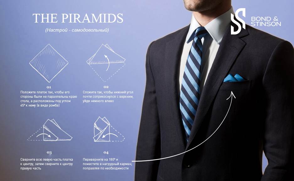 Платок в кармане пиджака – это классика, которая всегда будет в моде. Такой аксессуар повысит ваш статус и сделает ваш образ более деловым. Многие уделяют слишком много внимания выбору костюма и платка, и совсем забывают о том, что его нужно красиво сложить. Мы представим вам несколько самых простых техник, благодаря которым ваш платок будет выглядеть стильно и необычно.