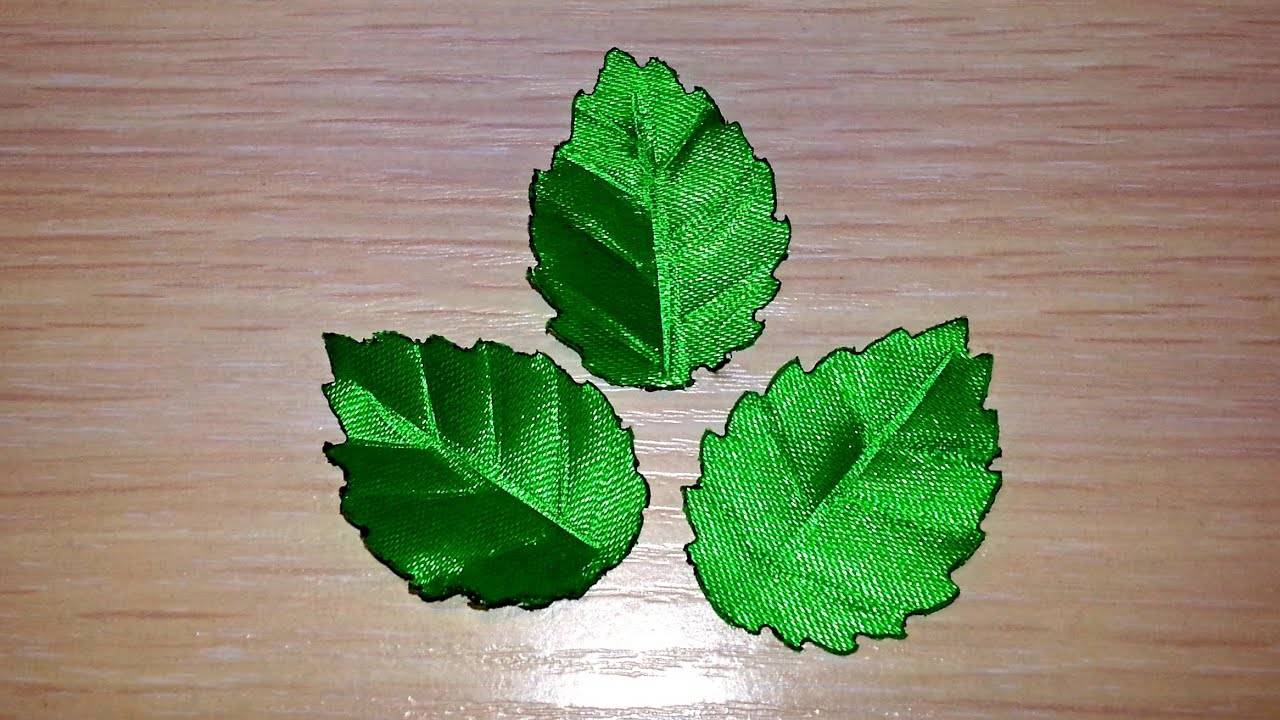 - или вырезать их из толстой зеленой ленты и обработав края зажигалкой просто пришить получившиеся листочки в нужных местах.
