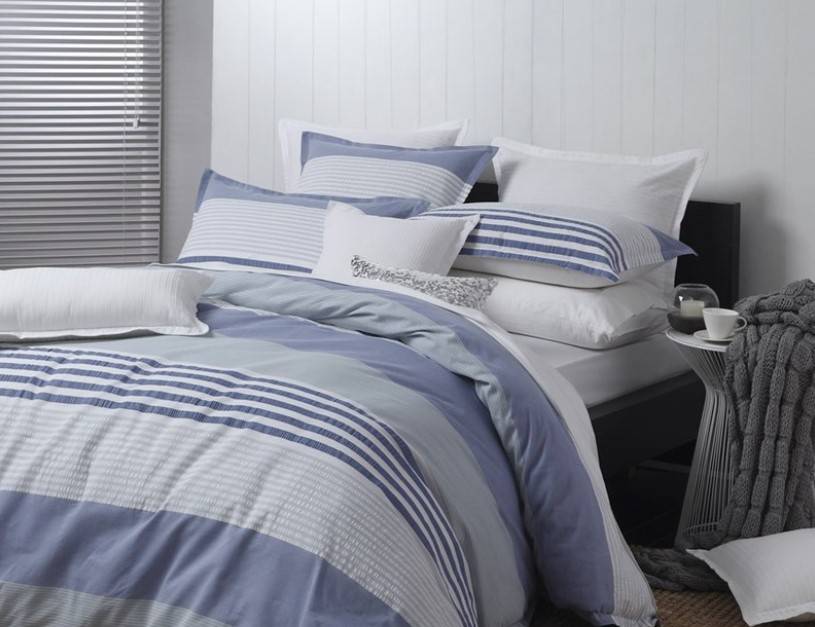 Белье с полосками светло-синего оттенка подойдет для детской комнаты