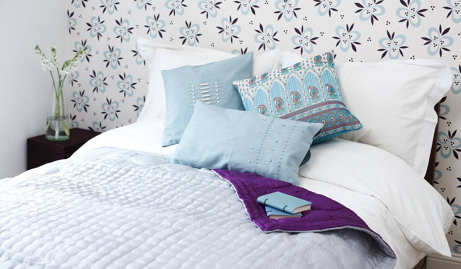 Орнамент на подушке может по цвету гармонировать с акцентной стеной в спальне