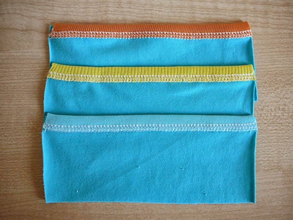 Трикотажная бейка кроится поперек петельного ряда. Для изготовления кроек не нужно придерживаться наклона на 45 градусов, ведь стачиваются полосы горизонтально.