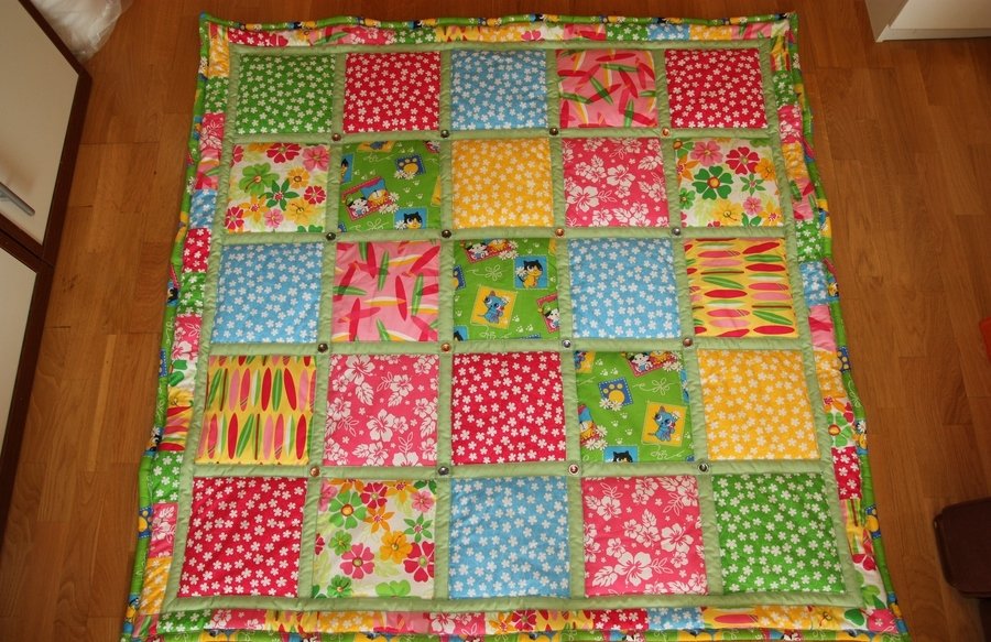 Детали заготавливаемого материала могут иметь форму квадрата, треугольника или круга и любую расцветку, главное заранее разработать дизайн будущего изделия. Выбранная ткань должна хорошо соединяться между собой. Данным методом можно не только сделать что-то новое, но и вернуть жизнь старым вещам, например, обшить облезлый ковер или затертое покрывало.