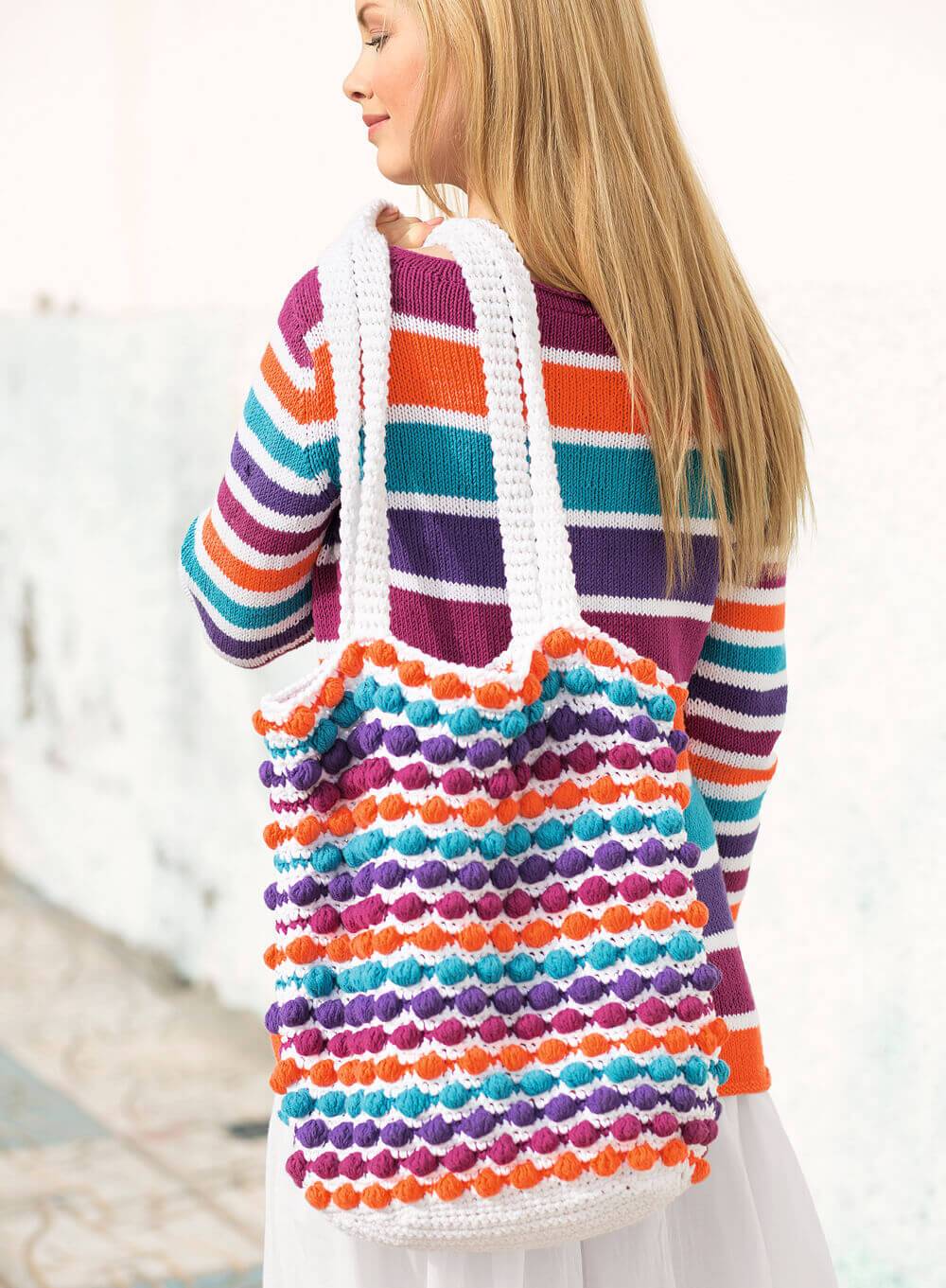 Узор для такой красивой пляжной сумки мы возьмём пышный столбик крючком. Вязаная сумка имеет высоту 33,5 см. и ширину – 39,5 см. Дно сумки и ручки вяжите столбиком без накида (СБН). Вяжем двойной нитью для того, чтобы сумка хорошо держала форму. Можно для донышка взять 1 основную нитку и 1 нитку типа верёвки.