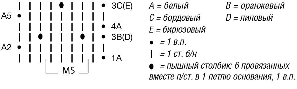Вязать белой пряжей цепочку из 45 ВП пышными столбиками. Начинаем с петель перед раппортом (4 СБН), этот раппорт повторяется постоянно, заканчиваем п. после рапп. Повторяются с 1-го по 6 – й р., соблюдая цвета, как на схеме. В первом и в каждом втором повторе схемы вязать цветом в скобках. Затем с двух сторон для округления прибавить с двух сторон во втором р. от начала 1 раз по 1 п., далее в каждом 6 – ом р. 3 раза по 1 п., итого получится 53 п. Заканчиваем работу, когда достигаем нужной высоты (52 р., или 33 см. от начала).