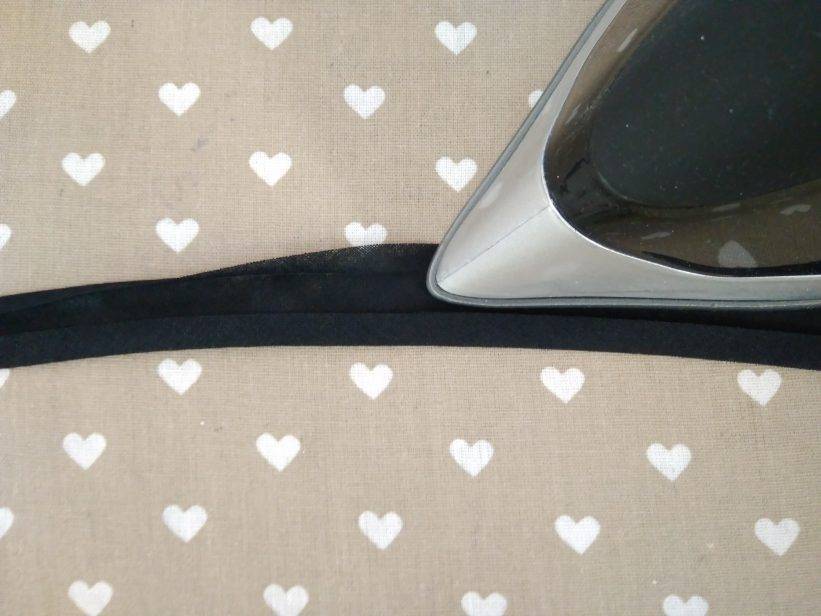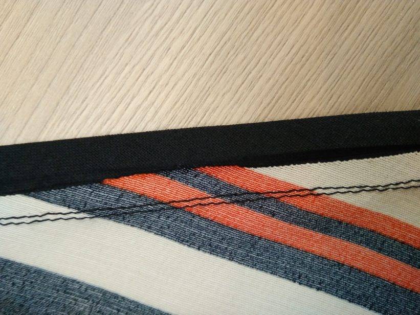 08. Перегибаю косую бейку на изнаночную сторону. Пришиваю сначала сметочными стежками, затем на швейной машинке отступая 1 мм. от края.