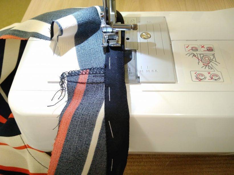 07. Нашиваю припуск на косую бейку. Строчку делаю на 1 мм. от края.