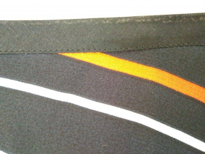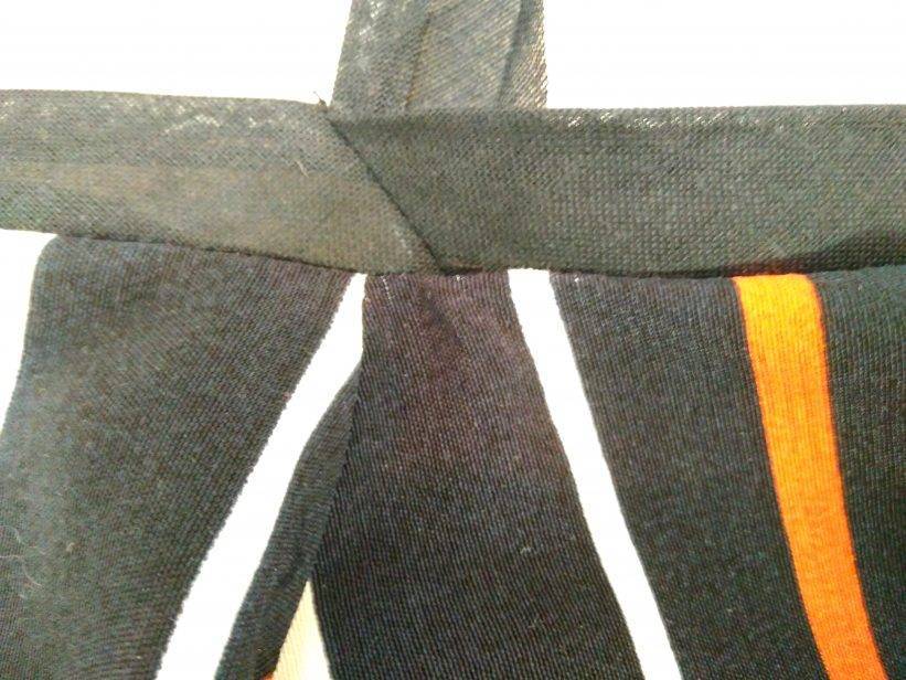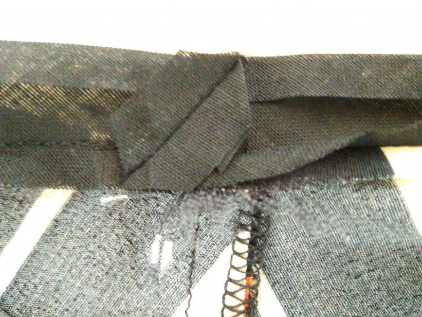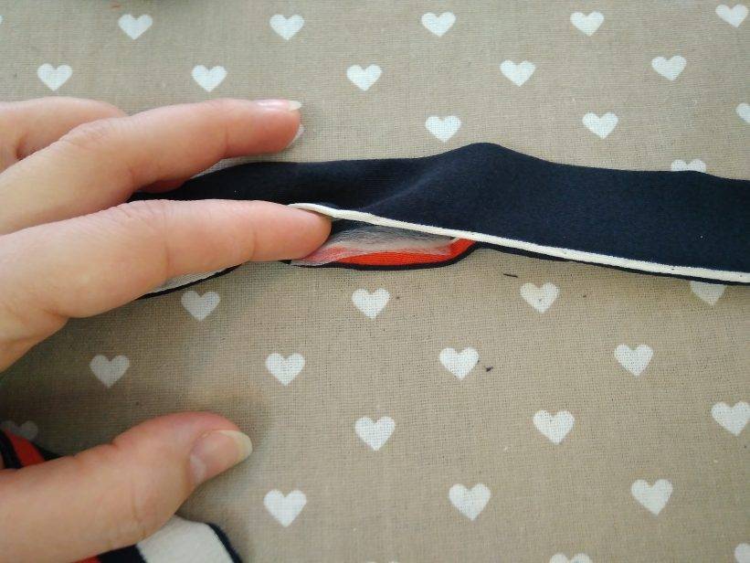 Для того чтобы сохранить её растяжимость соединяю концы бейки между собой по косой.