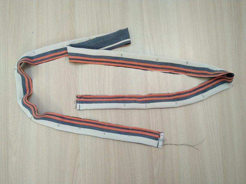 13. Последний шаг моего мастер класса — пошив пояса. Для этого беру выкройку пояса, складываю её пополам сшиваю с двух сторон, посередине оставляю незашитым отрезок в 4 — 5 см. для выворачивания на лицевую сторону.