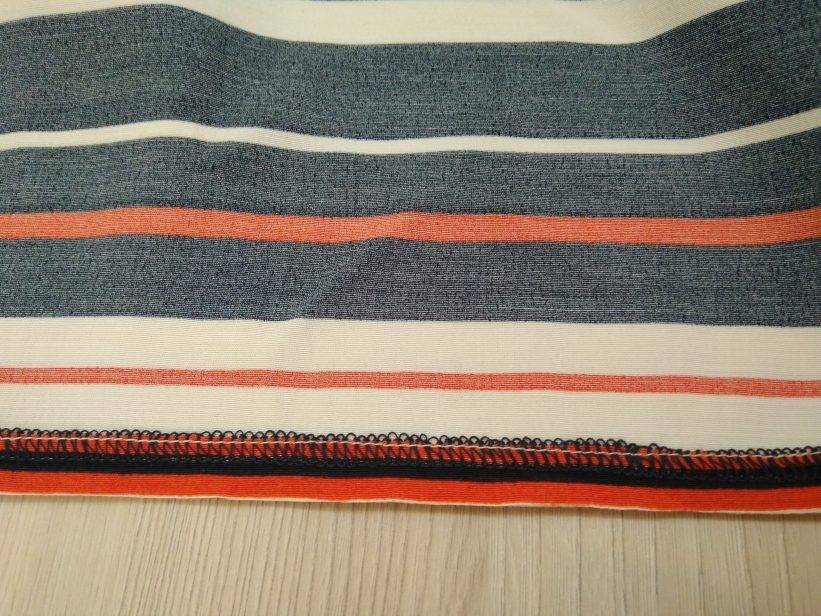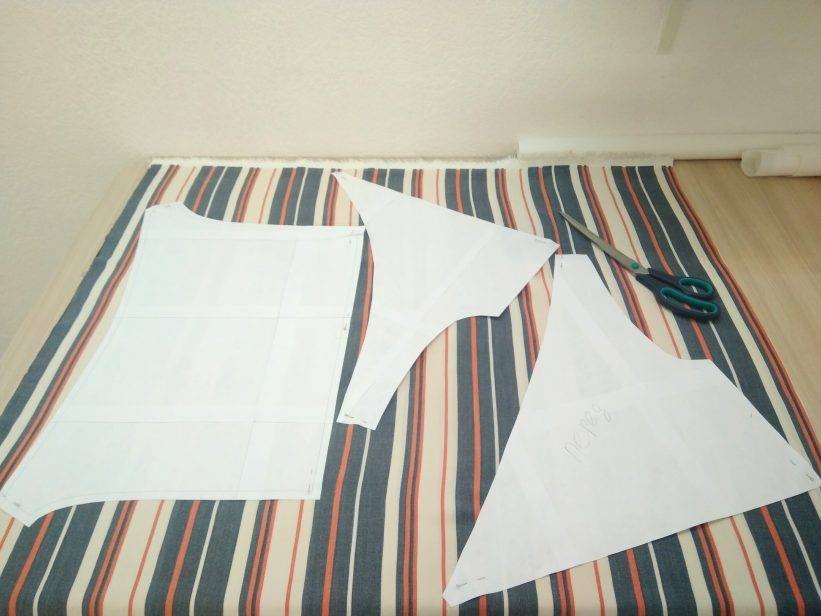 01. Раскладываю детали готовой выкройки на ткани, сложенной вдвое. Так чтобы на деталях спинки и переда направление полос на ткани шло под углом. Фиксирую кальку на ткани с помощью портновских булавок.