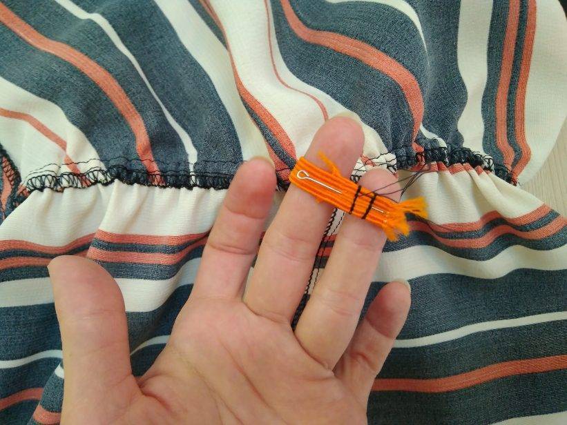 12. Надеваю на один конец резинки булавку. Вдеваю её в отверстие кулиски и провожу насквозь по всей лилии талии.