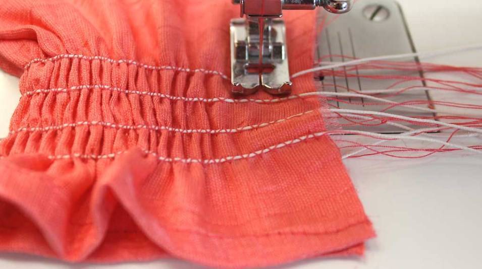 Закончив с первой строчкой, аналогично прокладываем ещё две-три. Пристрочив все резинки, удерживайте один их край (сразу всех!), а с другого края аккуратно потяните, стягивая их до необходимой длины.
