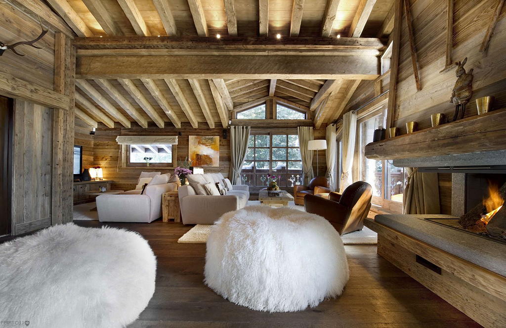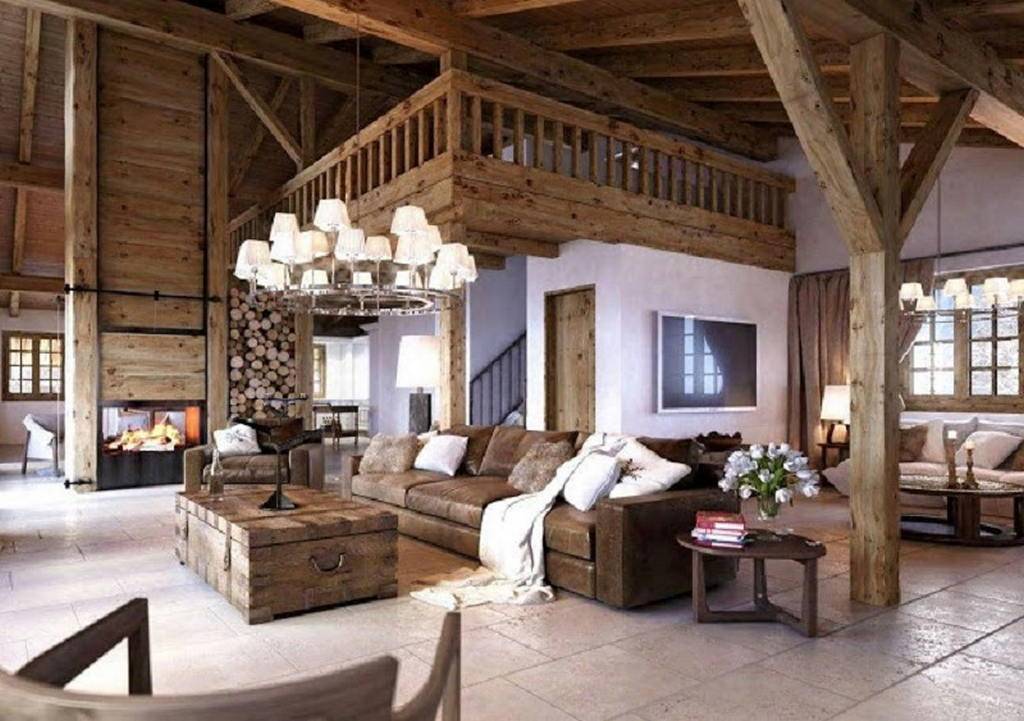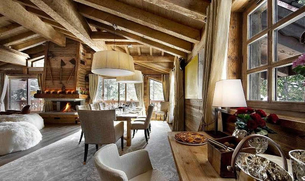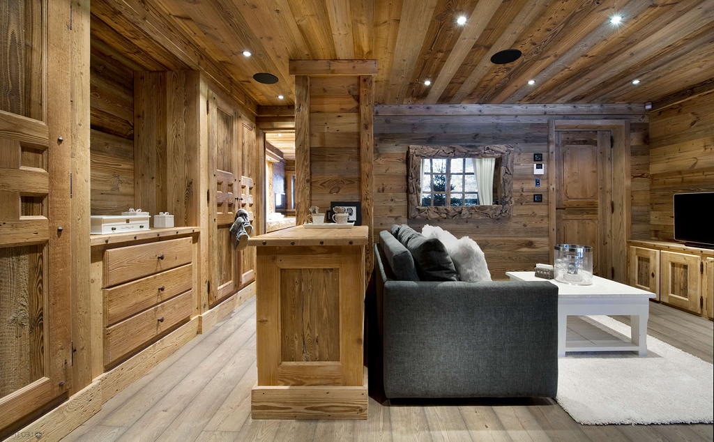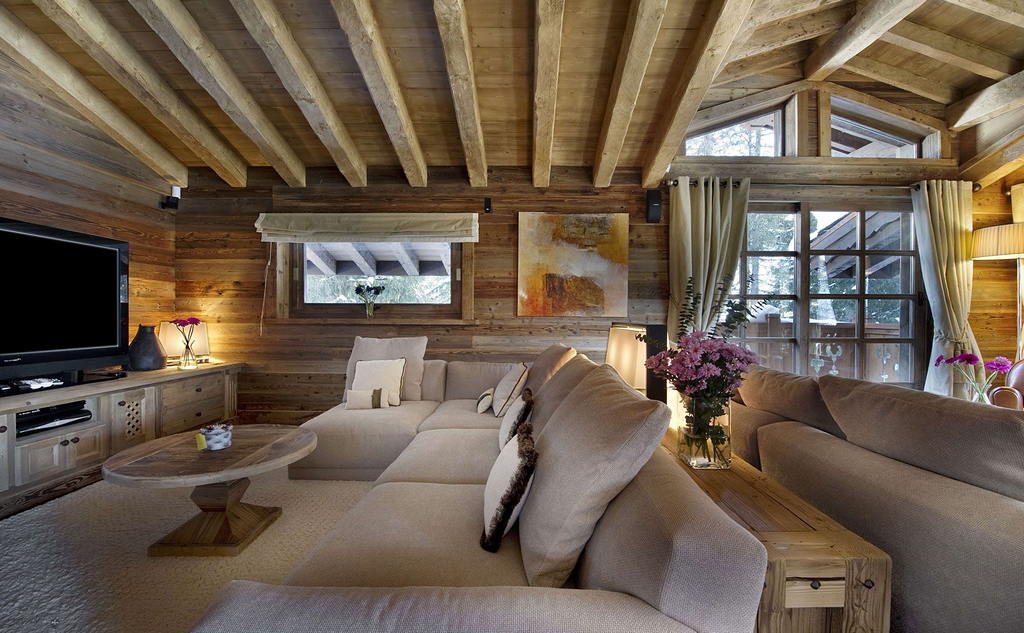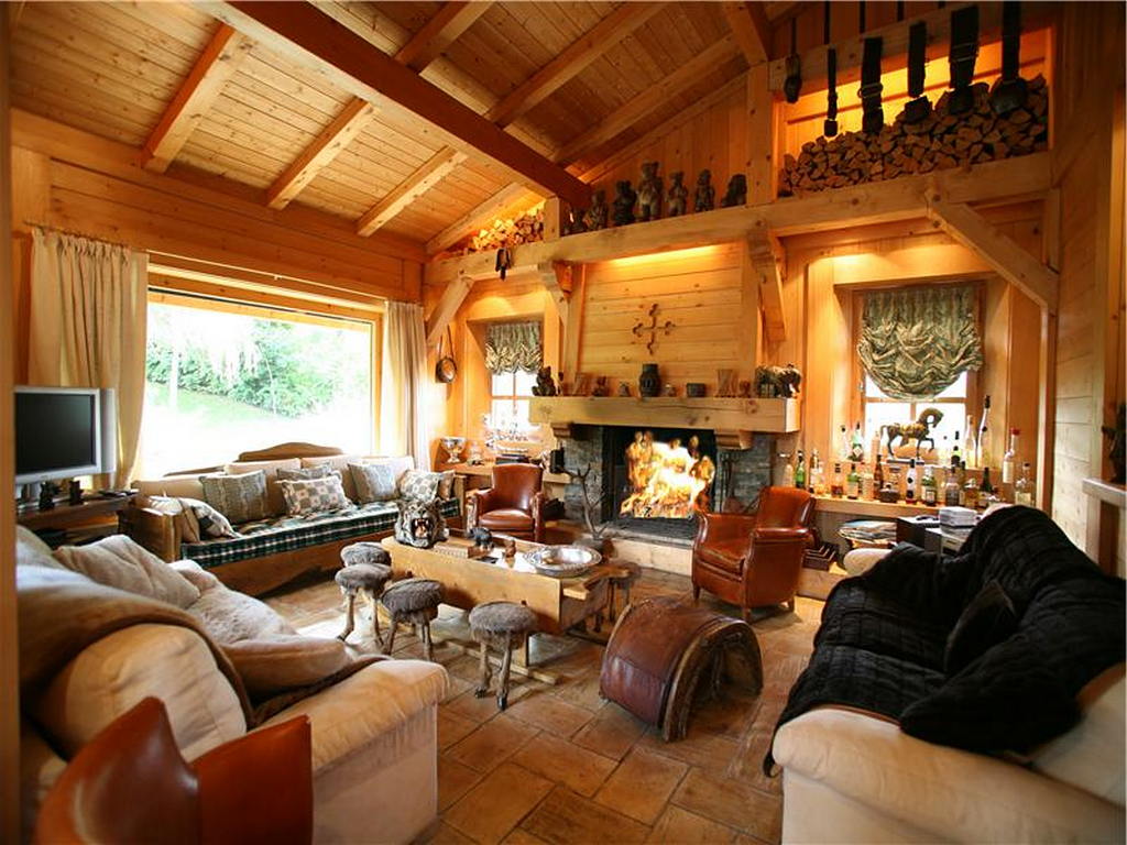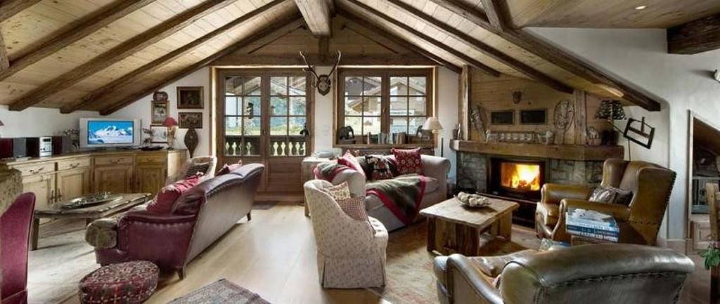 Таким образом, шале характеризуется применением исключительно натуральных материалов в отделке, превалированием дерева, простотой, минимумом обработки, отсутствием вычурности и роскоши, включением предметов ручной работы, использованием в качестве украшений охотничьих орудий и трофеев, большими габаритами мягкой мебели и наличием камина.