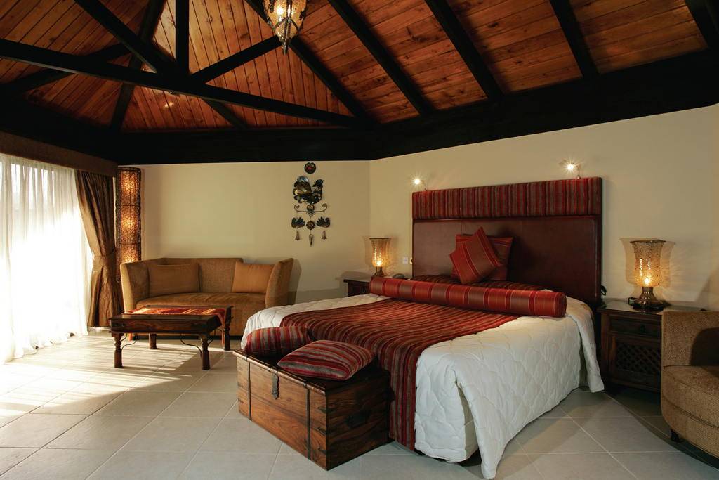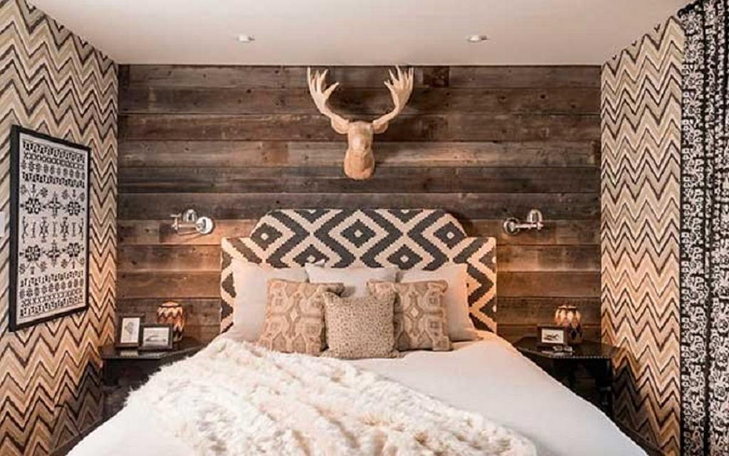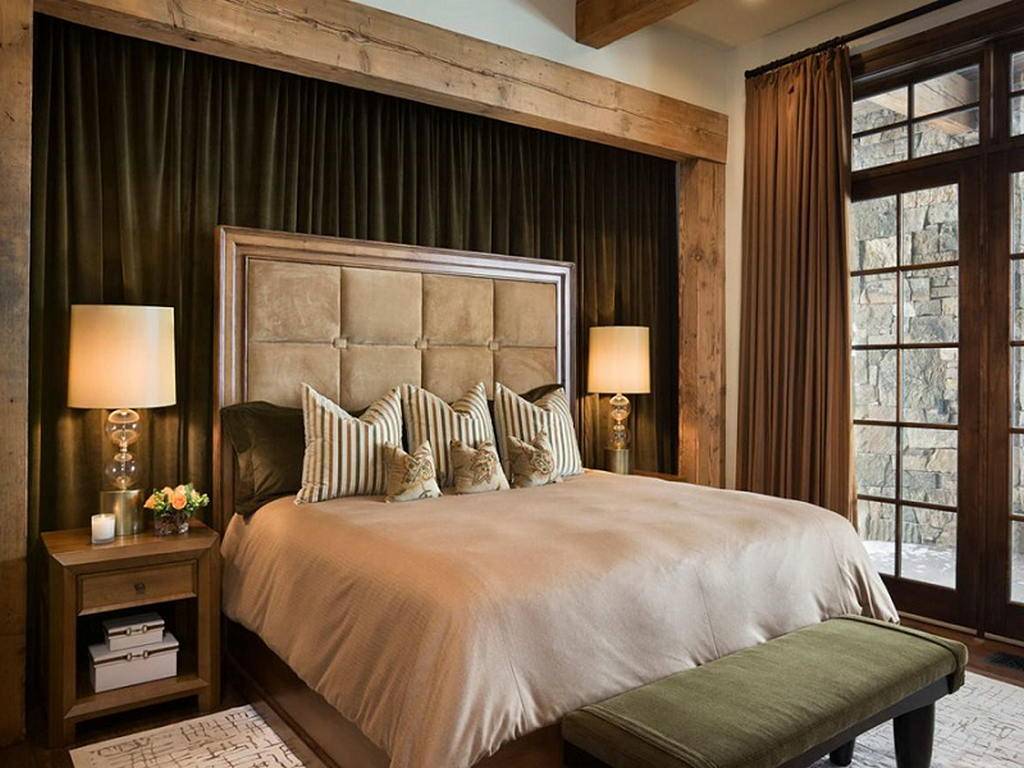 Потолок и пол традиционно отделывается деревянными панелями. Мягкий оттенок дерева и создаваемая им атмосфера тепла и надежности сделает вашу спальню по-настоящему комфортным местом для отдыха. Потолок уместно декорировать балками, а пол застелить пестрыми тканевыми коврами и звериными шкурами.