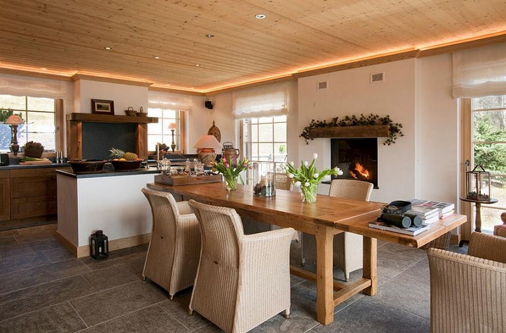 Но в комнате, где готовится пища, использовать дерево в качестве облицовочного материала не очень практично. Поэтому полы в кухне шале часто выкладываются каменной или керамической плиткой. В этом случае легко добиться их гармоничного сочетания с каменными рабочими поверхностями мебели или хромированным блеском бытовой техники.