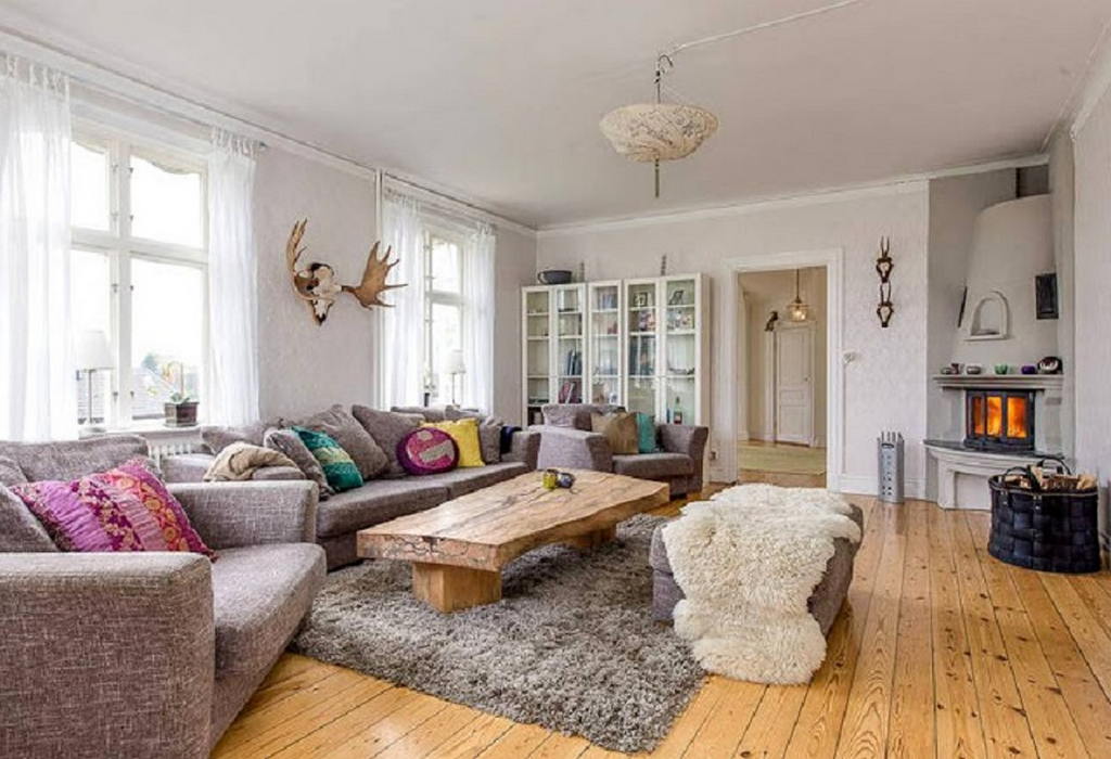 Текстильная составляющая представлена натуральными материалами и естественными тонами – некрашеными льном и хлопком, грубой шерстью, мехом, кожей. Гармонично смотрится на обивке мебели серый каменный цвет или оттенок выбеленного дерева. Шторы и гардины могут иметь чуть более насыщенную цветовую палитру.