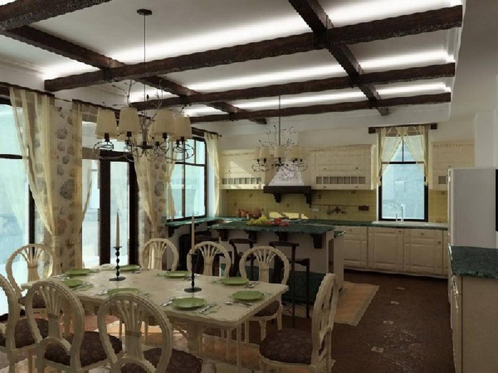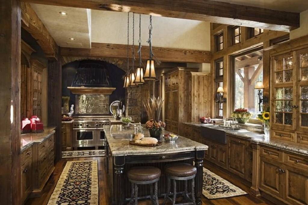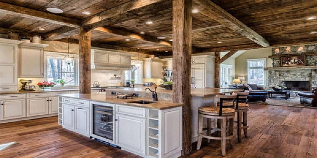 Простая деревянная отделка здесь смотрится наиболее гармонично. Балки на потолке и в виде колонн из состаренного потемневшего дерева безошибочно указывают на стиль.