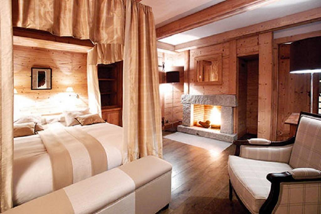 Одним из главных атрибутов в спальном интерьере, декорированном в стиле шале, является камин.