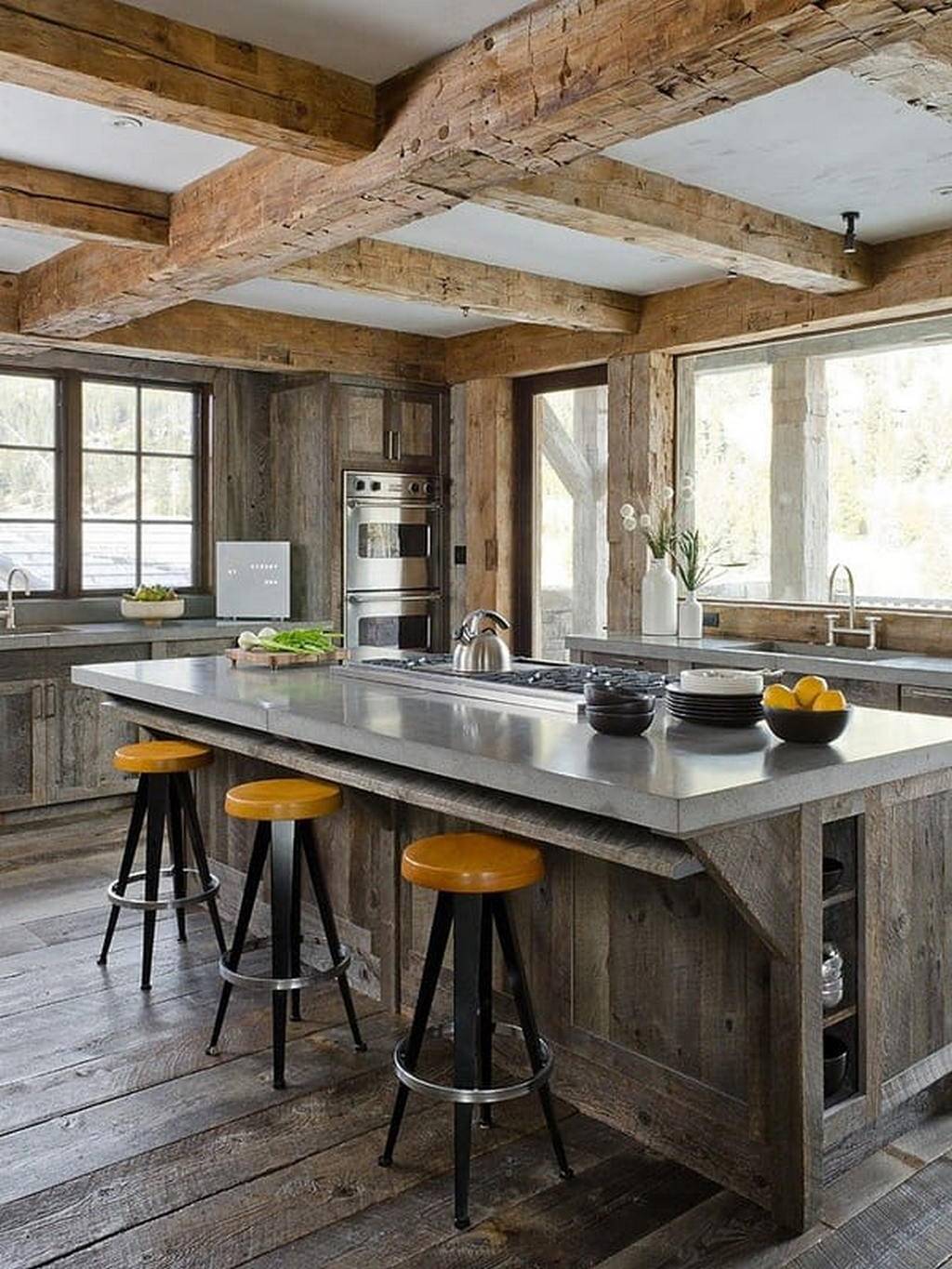 Контраст теплой фактурной древесины и холодного стального блеска бытовой техники придает кухонному интерьеру оттенок брутальности. При желании такого эффекта можно избежать, спрятав технику за деревянными фальшь-фасадами и заменив камень деревом.