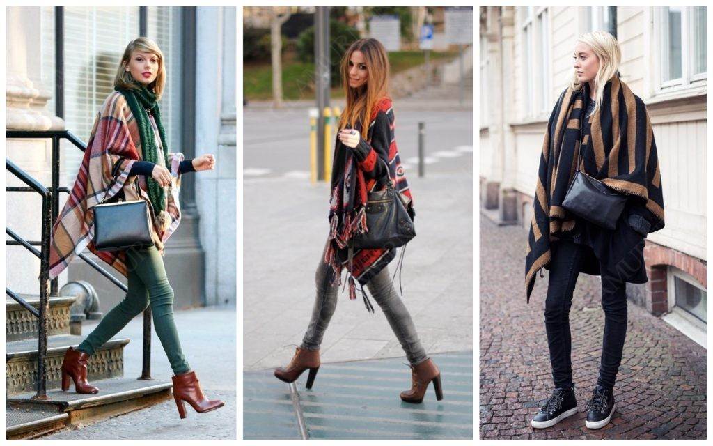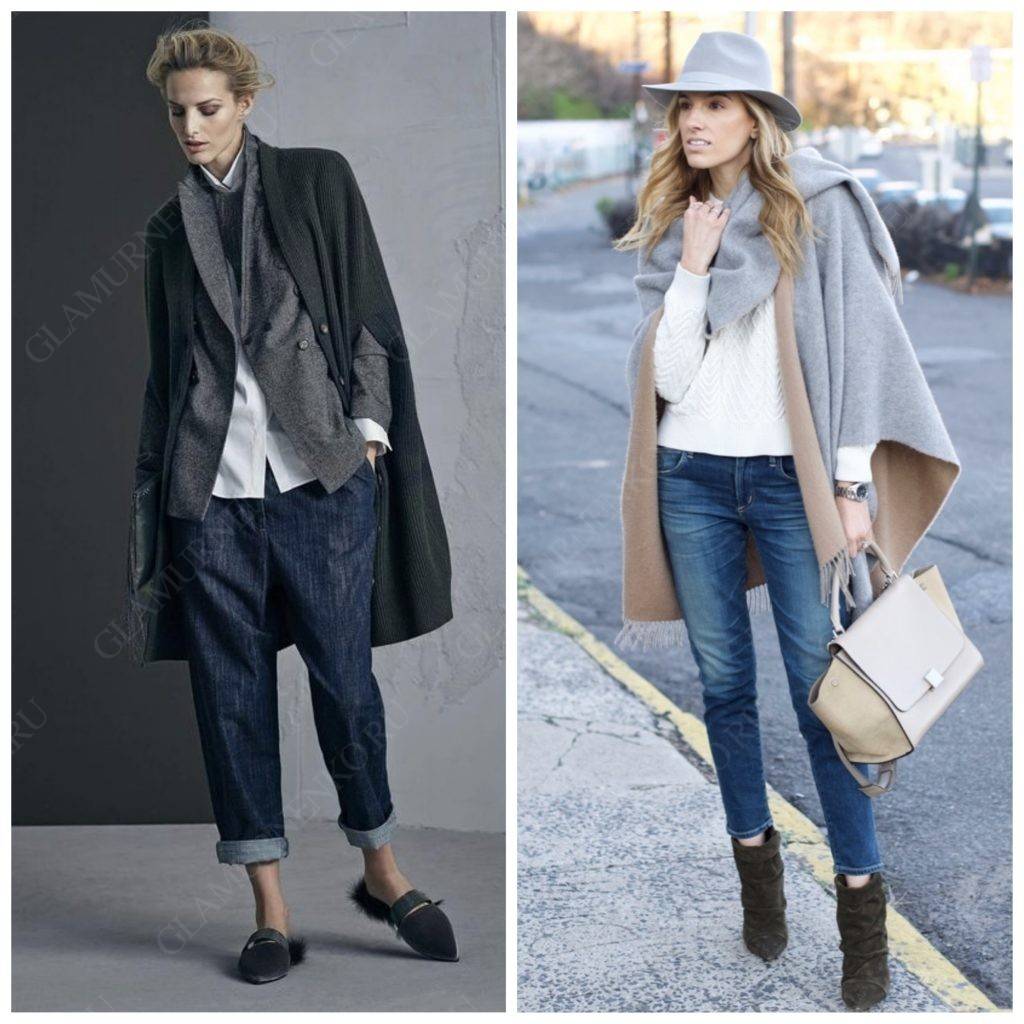 Не будем оставлять без внимания и другие варианты создания многослойности в осенне-зимних комплектах, например, использование различных «накидушек», а именно пончо, модных кимоно, кейпов. Это не только очень простой способ создать многослойность, но и отличный вариант спасти ситуацию, когда пальто не подходит вам по цвету. Вы просто отделяете пальто от лица вещью своего цветотипа, причем вещью, достаточно большой по площади.