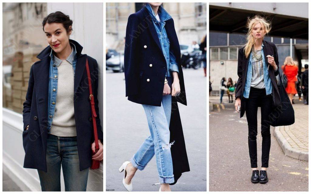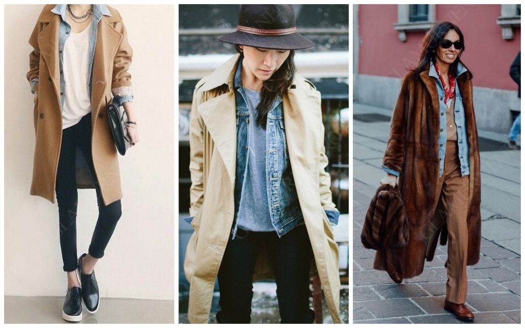 Примеры многослойности верхней одежды: джинсовая куртка и пальто; джинсовая куртка и тренч, джинсовая куртка и шуба
