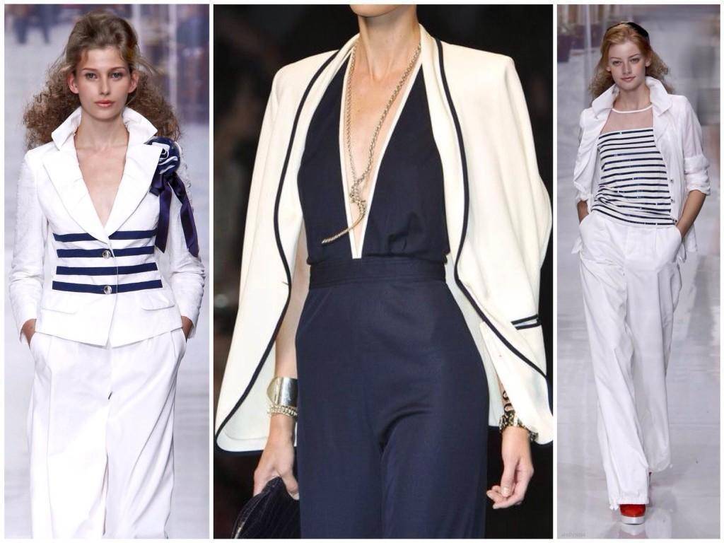Традиционно морской стиль свойственен коллекциям Шанель и Вивьен Вествуд. В последнее время к ним присоединяются D&G и Diesel. В текущем году тон задают прямые брюки черного или белого цветов, расклешенные книзу, и футболки.