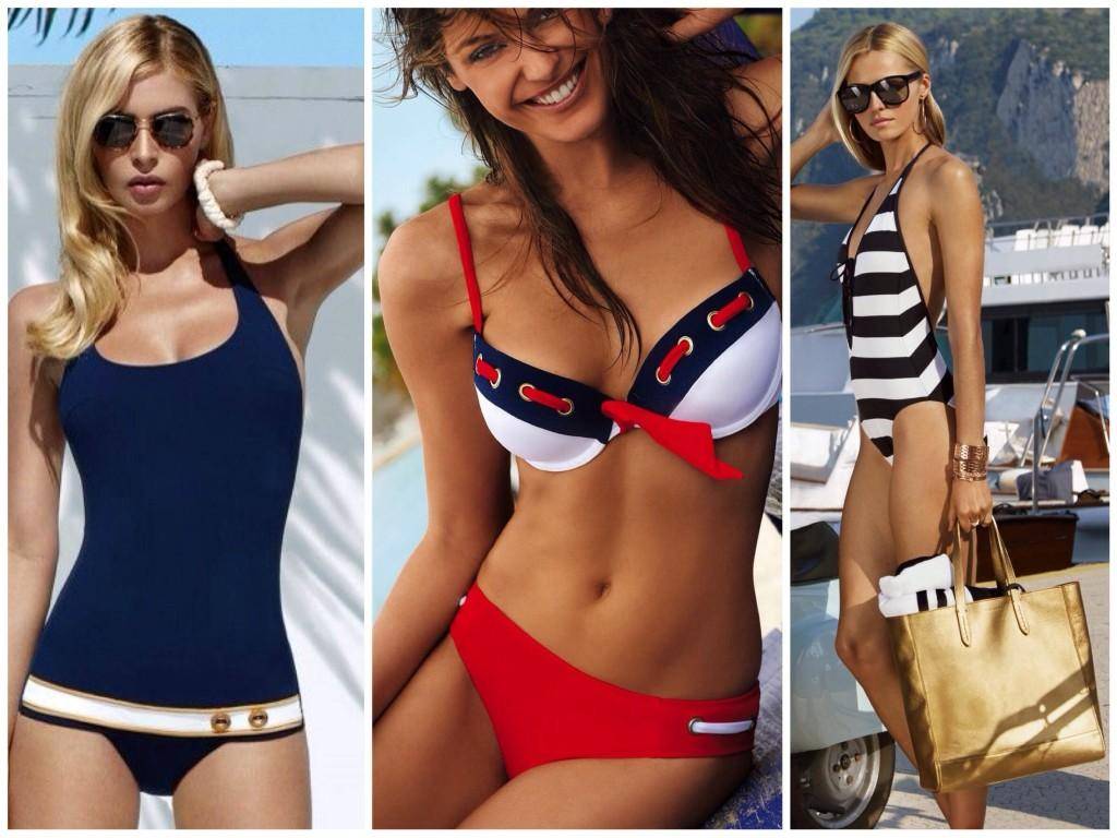 Купальники в морском стиле популярны уже несколько сезонов и считаются маст-хэвом в отпускном гардеробе любой девушки. Наиболее актуальны раздельные модели, в которых можно сочетать темно-синие плавки и белый верх или полосатые верх и низ. Слитный купальник в полоску сделает фигуру стройнее, если полосы идут вертикально или по диагонали.