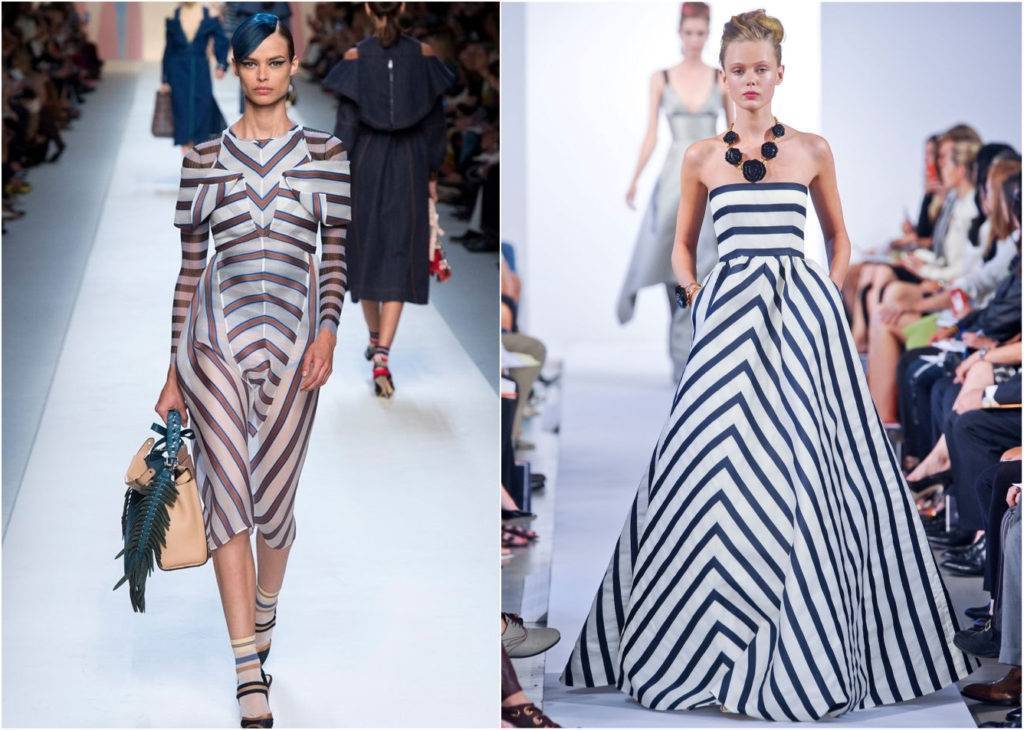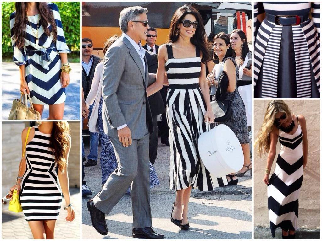 Наиболее популярный принт в одежде — полоска — представлен на фото. Она может быть различной и ширины и направлений. Тренд — красная горизонтальная полоса, которая также относится к морскому стилю. Платье в широкую или узкую полоску часто имеет расклешенную юбку или юбку в складку.