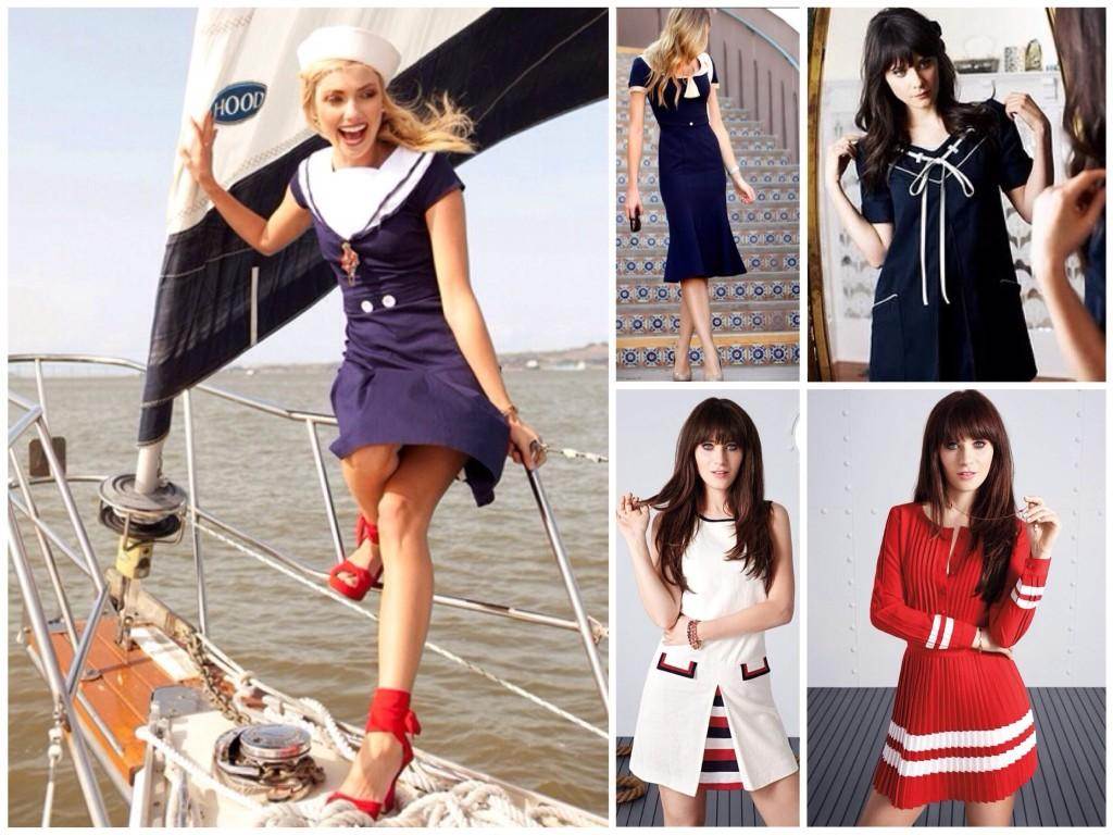 Платья с различными принтами. Без них не обходится ни одна коллекция модной одежды, посвященная морскому стилю. Совершенно необязательно надевать матроску, если хотите перевоплотиться в истинную морячку. Прелестные запахнутые платья или варианты с юбкой солнце подчеркнут женственность морского стиля. В особенности интересным смотрится сочетание этой одежды с бескозыркой и светлыми кедами или слиперами.