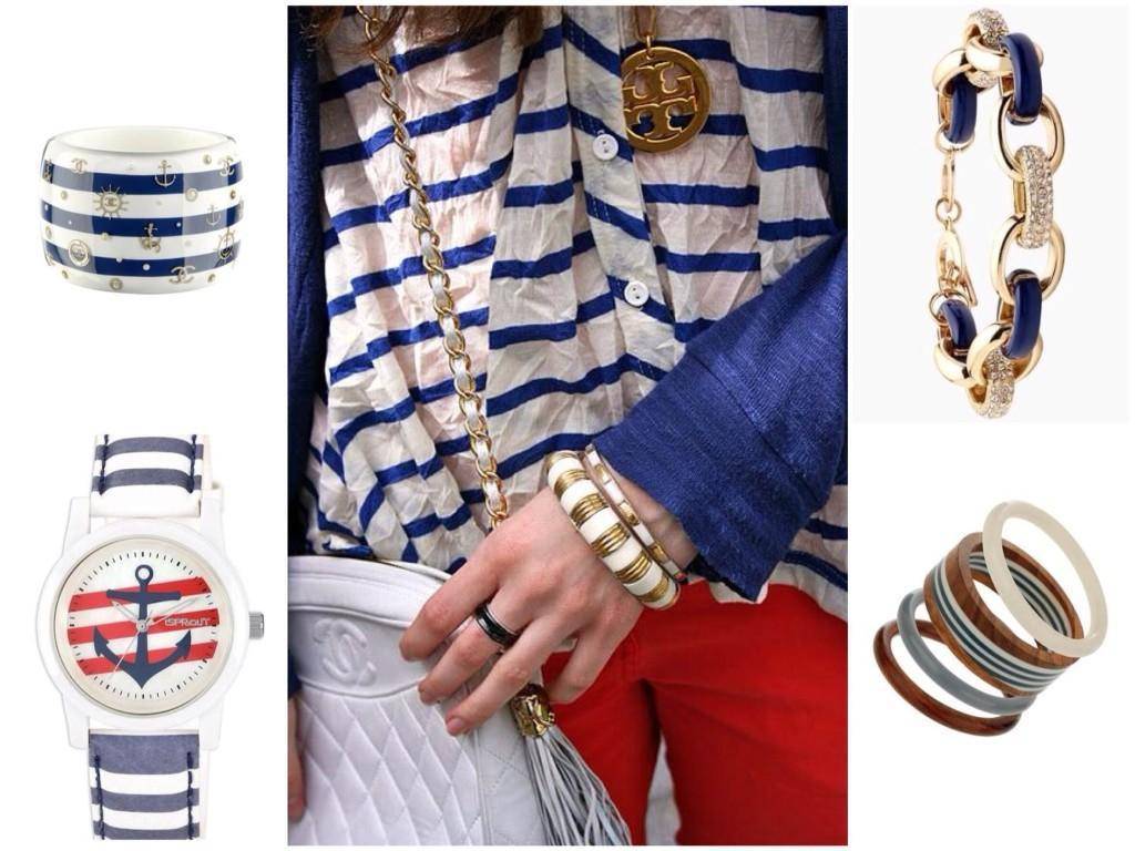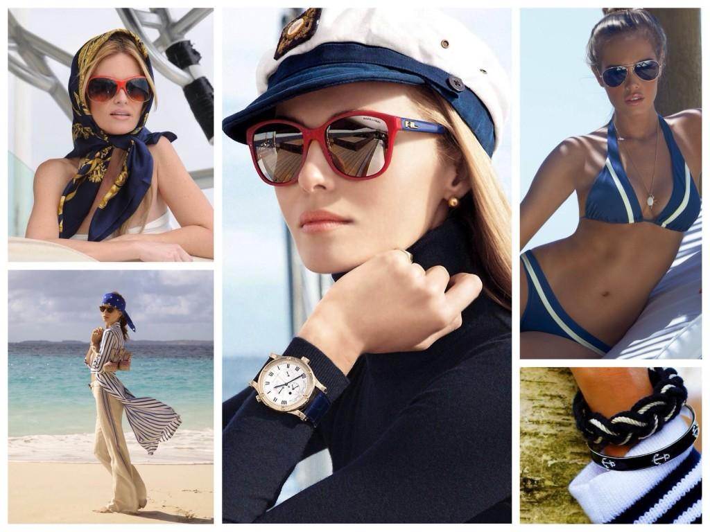 Аксессуары в морском стиле – это объемные торбы, плетеные сумки, крупные солнцезащитные очки в белой оправе, широкополые шляпы, белые береты и матросские фуражки. В качестве элементов отделки могут использоваться ракушки, декоративные якоря, металлические пуговицы, веревочные детали, вышивки на морскую тематику. Морская тема может повторяться и в украшениях: дополните образ браслетами, цепочками, серьгами и ремнями с деталями в виде якорей или напоминающими тросы.