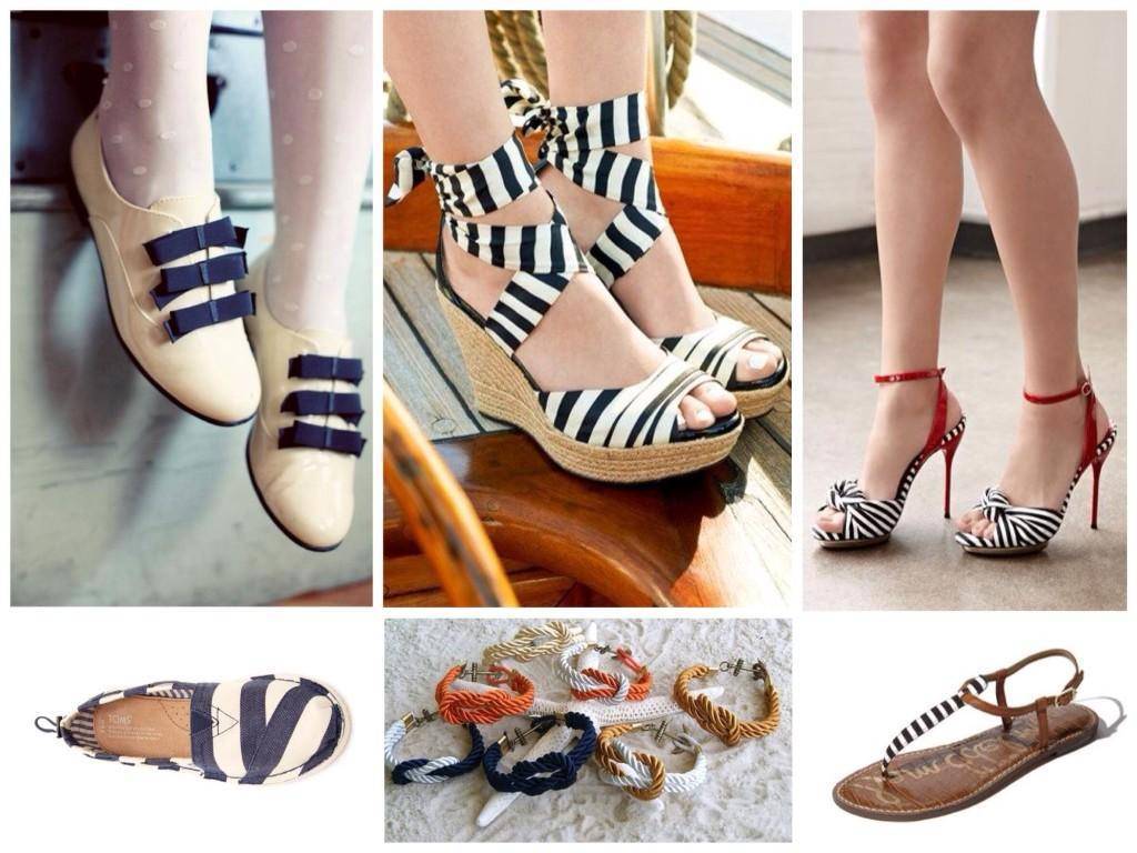 Полосатый принт часто украшает и обувь в морском стиле. Это могут быть и топсайдеры, которые пришли из яхтенного спорта, и удобные эспадрильи, и легкие балетки. Босоножки на пробковой подошве или танкетке с текстильным верхом в полоску подойдут и для пляжной вечеринки, и для морской прогулки по побережью.