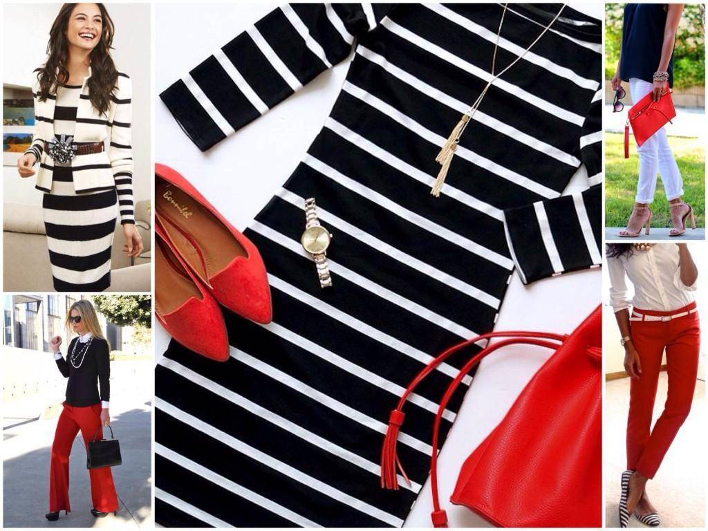 На фото яркий пример тому светлая юбка или прямые белые брюки в сочетании с блузой в бело-синюю (или красную) полоску. Обувь можно подобрать в нейтральном бежевом оттенке или в трех основных цветах — черном, белом, синем.