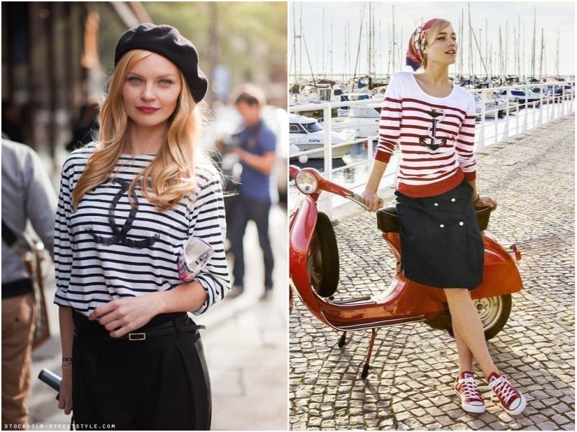 Самый популярный элемент морского стиля – это, безусловно, тельняшка. Она может быть выполнена в форме свободной туники, трикотажного лонгслива или облегающего топа. Дополнить ее можно синими, черными или серыми брюками, темно-синим или черным жакетом, лодочками или босоножками. Полоска может быть не только классической бело-синей или бело-черной, но и бело-красной или серо-черной.