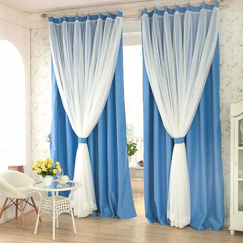 Размещение 2 штор на одном карнизе возможно при выборе штор из плотной ткани и тюля. Вместо традиционного варианта расположения, полупрозрачный материал помещают вперед. Подвязанные бантиком занавески будут гармонично вписываться в интерьер. По вечерам можно развязывать только плотные занавески, расположенные сзади, оставляя тюль в том же виде.