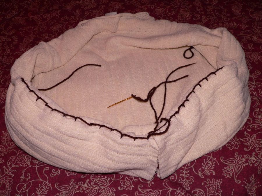 - Основную часть свитера набить наполнителем или вставить в нее, подготовленную заранее, подушку подходящего размера.