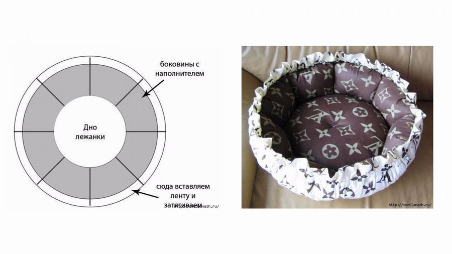 Вот пример круглой лежанки. На схеме указаны места боковин с наполнителем и места, куда нужно будет вставить ленту и затянуть (для достижения такого же эффекта, как на фото).