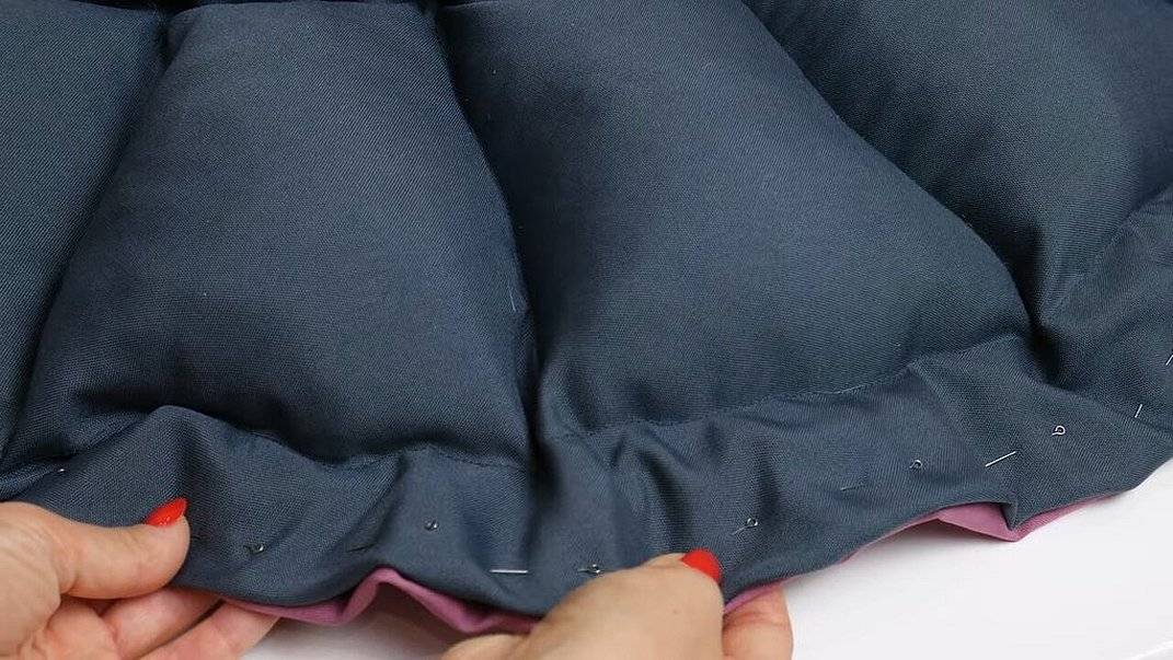Края бортиков обмётываем зигзагом или обрабатываем косой бейкой. Пришиваем на машинке бортик по окружности днища, оставив открытые участки для наполнения.