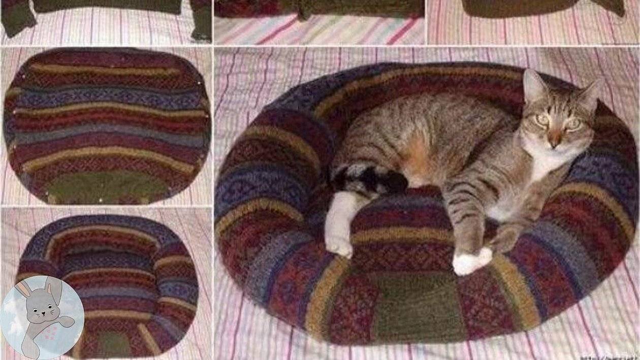 Чтобы освободить полки и дать вторую жизнь ненужным вещам, можно сделать теплый и уютный лежак из свитера. Как быстро сшить лежанку для кошки, детально рассмотрено в этом мастер классе.