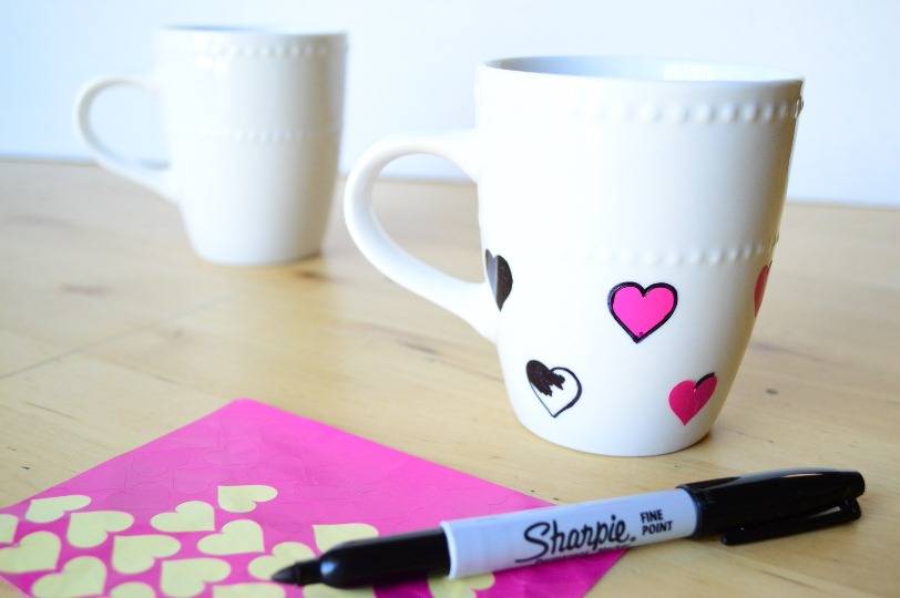 - На кружке скотчем закрепить трафарет и разукрасить по нему будущий подарок.