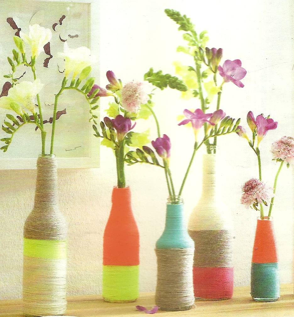 В декорированную вазу из бутылок можно поставить цветы