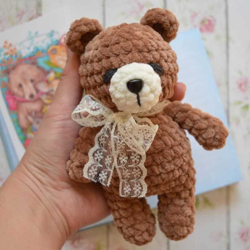 Важно! Удобнее всего выполнять работу крючком, чтобы фактура деталей была плотной и длительно сохраняла форму. К тому же, вязать мелкие части мишки крючком намного легче, чем спицами